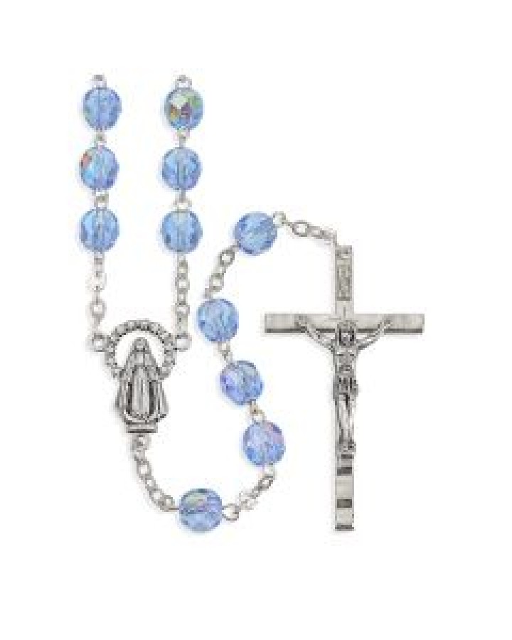 New to our collection of fine quality, inexpensive Catholic rosaries. Our beautiful 7 mm Faceted Blue Bead Rosary has a detailed silver oxidized ‘Mary’ center, and stunning crucifix. Fine quality and inexpensive, this Catholic rosary is perfect to give, or add to favors for that special occasion, such as Baptism, Christening, Communion, Confirmation, Birthday, Anniversary, Wedding, or Ordination. Give as a special inspirational gift at Christmas, Easter, or Thanksgiving.