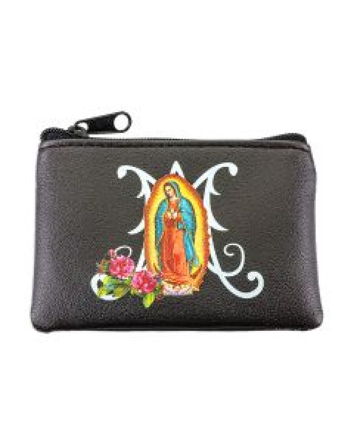 Black Leatherette Rosary Pouch with Our Lady of Guadalupe Image.