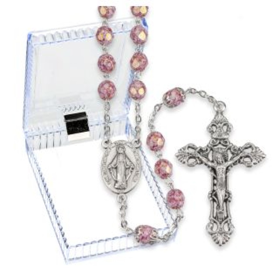 7mm Faceted Pink Alabaster Luster Glass Fire Polished Bead Rosary with Double Capped Our Father Beads.