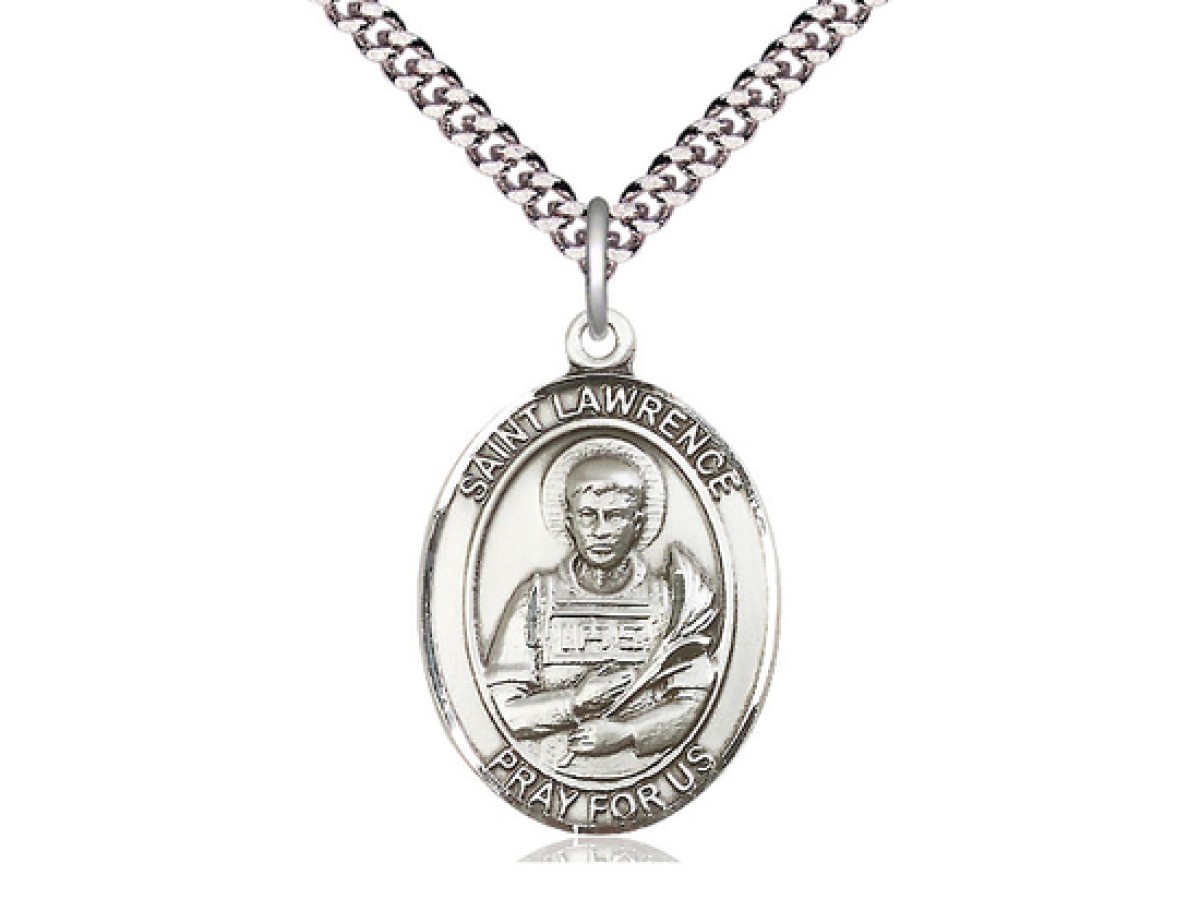 Sterling Silver St Lawrence Pendant on a 24 inch Light Rhodium Heavy Curb Chain.