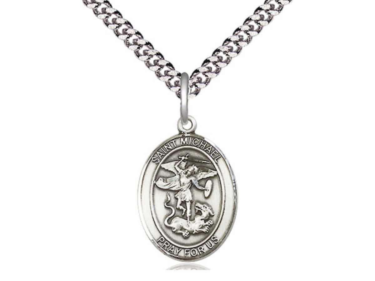 Sterling Silver St. Michael the Archangel on a 18 inch Light Rhodium Heavy Curb Chain.