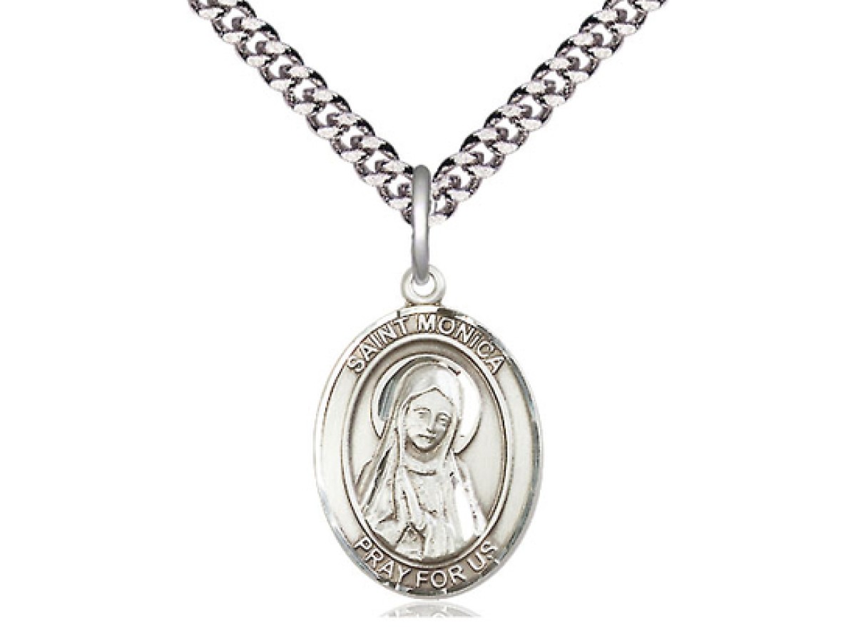 Sterling Silver St Monica Pendant on a 18 inch Light Rhodium Heavy Curb Chain.