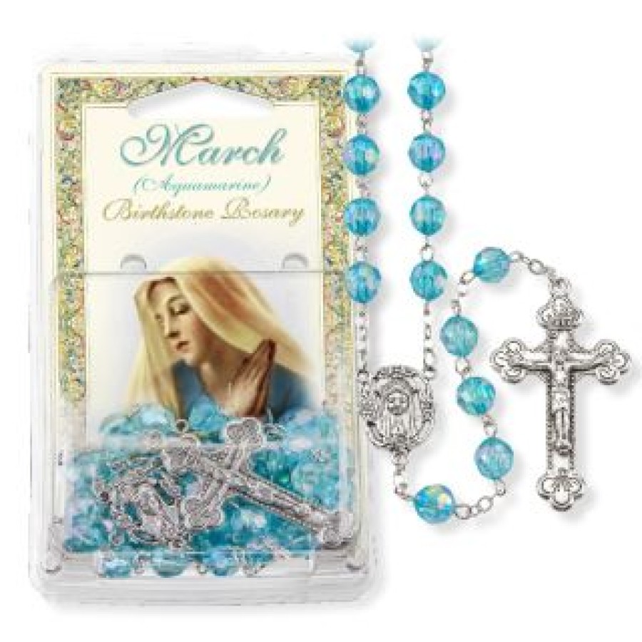 Quality aurora borealis faceted colorful and inexpensive Catholic rosaries. Our beautiful 8 mm Aurora Borealis Faceted Acrylic ‘March-Aqua’ Birthstone Bead Rosary has a detailed silver oxidized ‘Mary’ center and stunning crucifix. Fine quality and inexpensive, this Catholic rosary comes packaged with our Italian ‘Fratelli Bonella’ artwork, ready to hang. Perfect to give or add to favors for that special occasion, such as Baptism, Christening, Communion, Confirmation, Birthday, Anniversary, Wedding, or Ordinations. Give as a special inspirational gift at Christmas, Easter, or Thanksgiving.