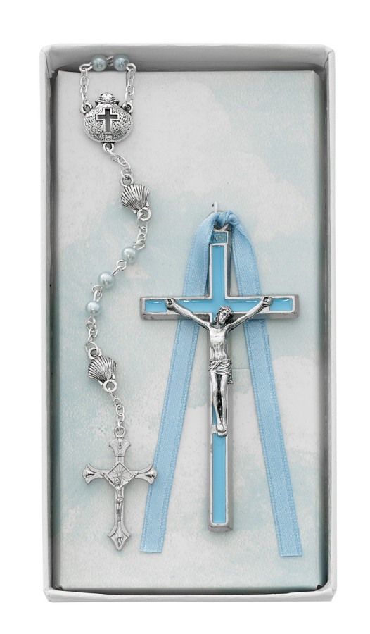 3.75 IN. SILVER OXIDIZED BLUE ENAMEL CRUCIFIX WITH 3MM BLUE PEARL BEADS. SILVER OXIDIZED CRUCIFIX,CENTER AND SHELLS. GIFT BOXED. BLUE RIBBON INCLUDED FOR HANGING.