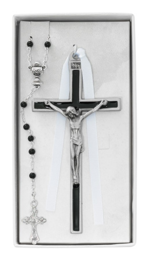 5″ BLACK ENAMELED CRUCIFIX WITH BLACK GLASS COMMUNION ROSARY, BOXED. MADE IN THE USA.