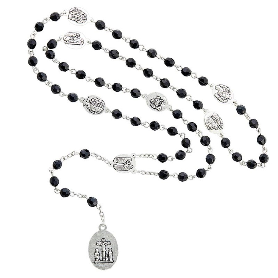 Features black faceted beads and individual medals with images of the Seven Sorrows of the Blessed Virgin Mary