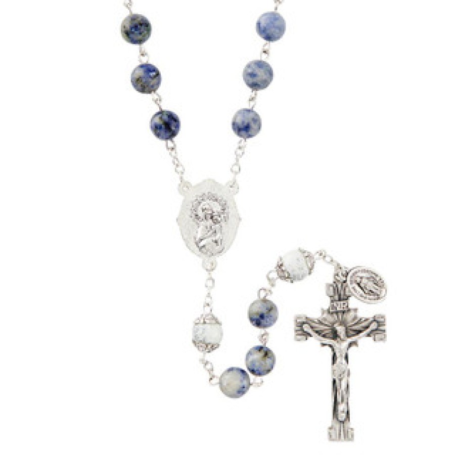 Size:8mm Blue Spot Stone Beads, 8mm Double-Capped Stone Our Father Beads, 23″ L, 5/8″ Sacred Heart Centerpiece, 2-3/4″ Crucifix, 3/8″ Miraculous Dangle